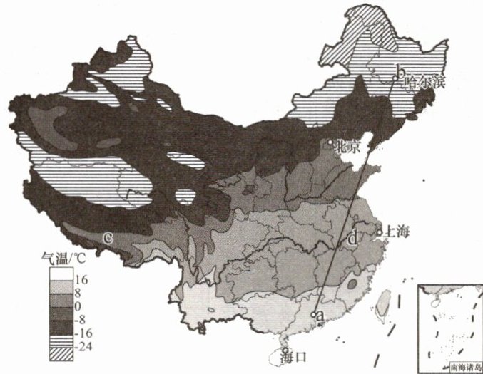 。(4)哈尔滨、北京、上海、海口四城市中,1月平均气温在$0^{\circ}C$以下的有