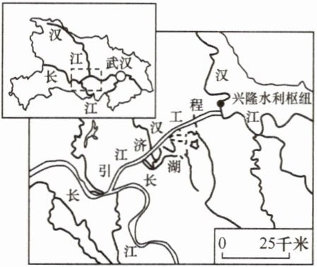 “引江济汉”工程(下图)是连接长江和汉江的一条输水通道,该工程建成通水,改善了汉江下游的用水条件。据此完成4~6题。