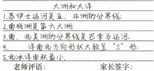 [新考法 情境创设]学习了《世界海陆分布》一节后,李丽做了笔记(如下图所示),她的笔记有一处错误和一处遗漏。据此完成 3~4 题。