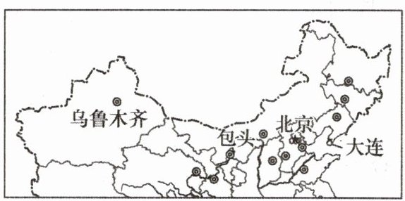不同城市路灯开关时间不同。为了更好地节约能源,一般情况下,路灯开灯时间在日落前后,关灯时间在日出前后。读大连、北京、包头和乌鲁木齐的地理位置示意图,完成5~6题。