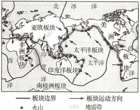某年,全球共有 74 座火山喷发。火山喷发会烧毁森林、房屋,掩埋农田和城市,污染空气,但同时也带来肥沃的土壤和丰富的矿产等资源。读六大板块和世界主要火山、地震带分布示意图。据此完成 5~7 题。