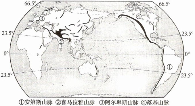 地球表面高低起伏,山高与海深相差悬殊,地表形态复杂多样。下图为世界主要山脉的分布图。据此完成 1~2 题。