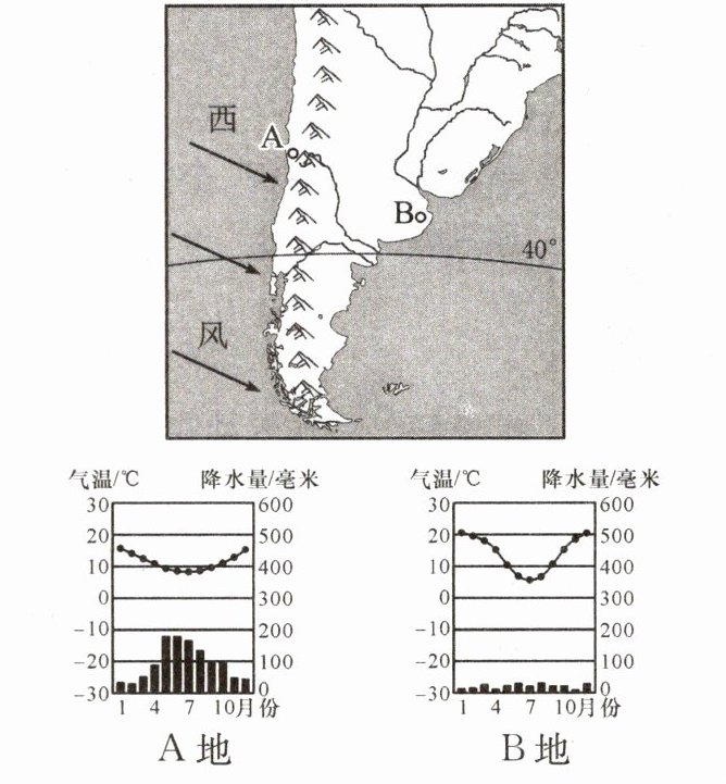 读南美洲安第斯山脉南段及A、B两地的气候资料图,完成8~9题。