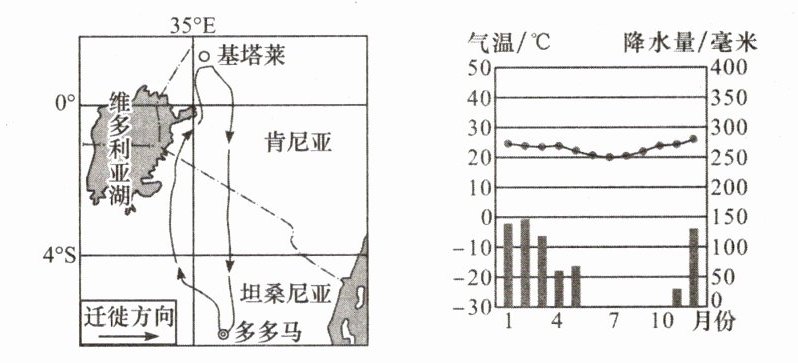 下图示意动物迁徙路线和多多马气候资料。据此完成3~4题。