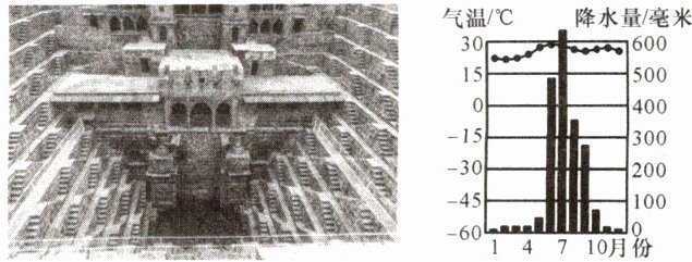 “阶梯井”是古印度文明的标志性建筑,高达数米的石阶将水源围在中央,成为当地人汲水与纳凉的场所。因蓄水、纳凉功能的逐渐淡化,“阶梯井”多处于衰退状态。如图示意印度斋浦尔市的“阶梯井”及该市的气候资料。据此完成5~7题。