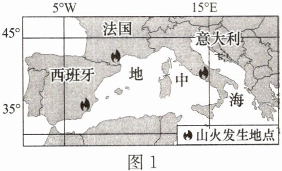 资料一 2024年7—8月,受持续高温天气的影响,地中海附近多国山火频发。西班牙、葡萄牙、意大利、法国等国家均投入大量人力物力与林火搏斗。图1为山火发生地点,图2为山火发生地气候资料。