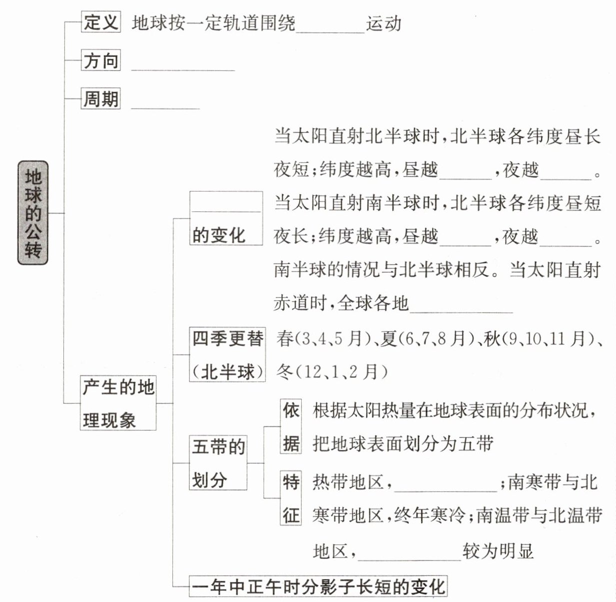 太阳 自西向东 一年 昼夜长短 长 短 短 长 昼夜等长 终年炎热 四季变化