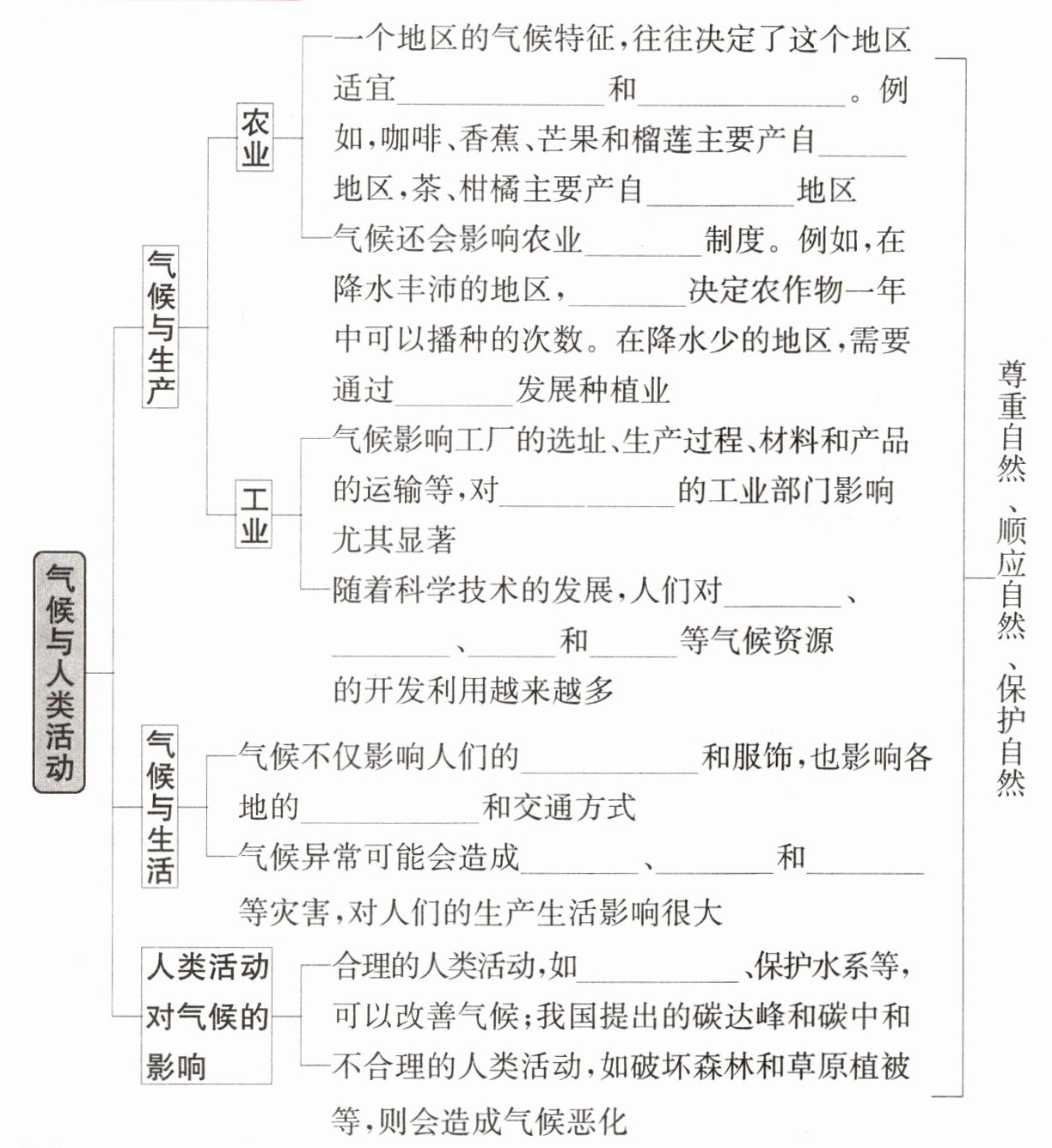 种植的作物 养殖的牲畜 热带 亚热带 耕作 热量 灌溉 露天生产 光能 热量 水分 风能 饮食习惯 房屋建筑 洪涝 干旱 寒潮 植树造林