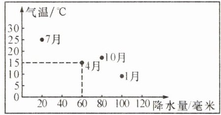 下图为世界某地气温和降水量统计图( 如4月气温为15℃,降水量为60毫米)。据此完成1~2题。