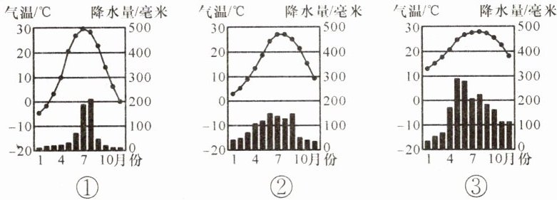 如图为我国三地多年平均各月气温和降水量柱状图。据此完成6~8题。