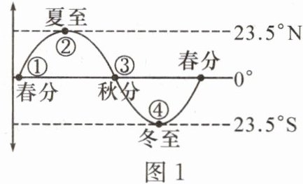 如图1是太阳直射点一年当中回归运动的示意图。据此完成9~11题。