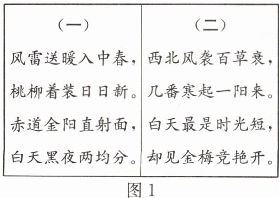 跨学科 语文 二十四节气是中华民族祖先在历法上的独特创造和智慧结晶,已被列入世界非物质文化遗产名录。现代诗人左河水为二十四节气分别赋诗一首,其中两首如图1诗词选卡片所示。结合卡片和图2地球公转示意图,完成7~8题。