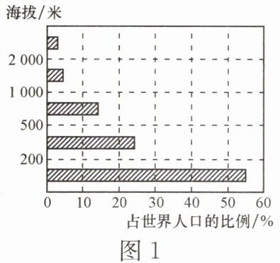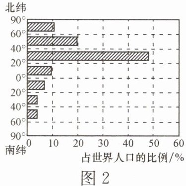 世界人口分布不均匀,但又有一定的规律。图1为世界人口在不同海拔地区的分布图,图2为世界人口在不同纬度地区的分布图。据此完成6~7题。