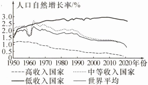 读1950—2020年不同收入国家的人口自然增长率变化曲线图,完成3~5题。