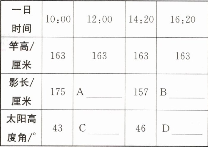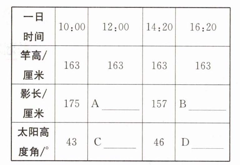 (2)同学们测得两个时段的影长为114厘米、294厘米,太阳高度角为55°、29°,请将四个数据填在表格的相应位置。