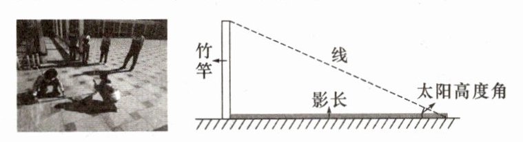 测量步骤:①在操场上,竖一根竹竿,垂直于地面;②从竹竿的顶端拉一条线到竿影的末端;③测量影子的长度,测出线与影子形成的角度,即太阳高度角。