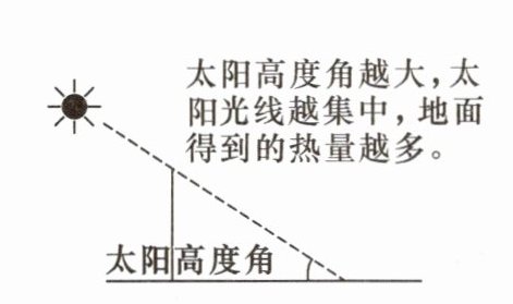 太阳高度角越大,太阳光线越集中,地面