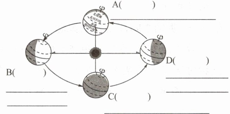 以北半球为例,在图中填出二分二至日的名称、时间及昼夜长短的情况。