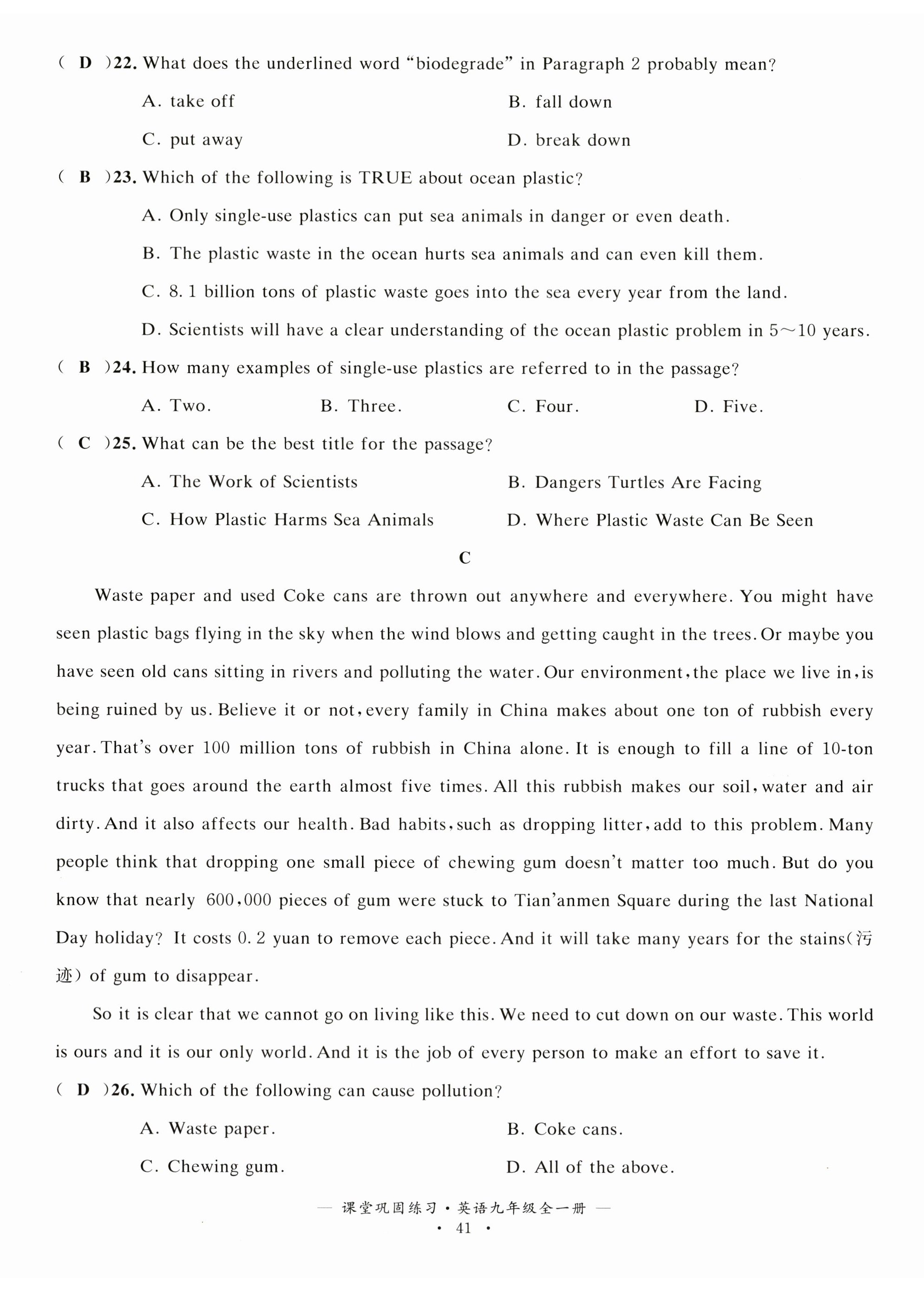 注:目前有些书本章节名称可能整理的还不是很完善,但都是按照顺序排列的,请同学们按照顺序仔细查找。练习册 2025年课堂巩固练习九年级英语全一册仁爱版 答案主要是用来给同学们做完题方便对答案用的,请勿直接抄袭。