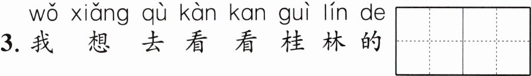 3. 我想去看看桂林的$\begin{array}{|c|c|} \hline shān & shuǐ \\ \hline & \\ \hline \end{array}\\ \hline & \\ \hline $。