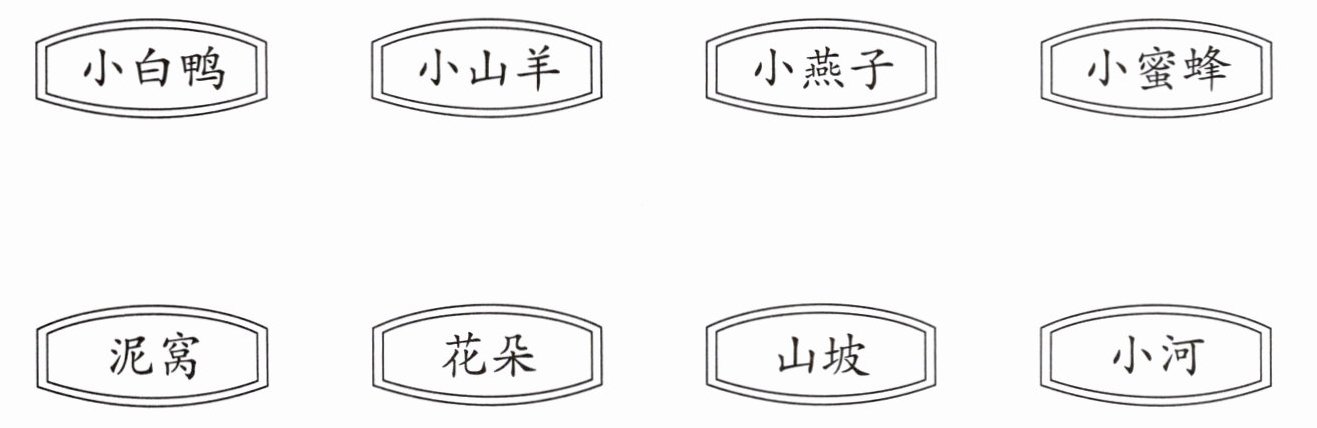 $\boxed{\mathrm{小白鸭}}$ $\boxed{\mathrm{小山羊}}$ $\boxed{\mathrm{小燕子}}$ $\boxed{\mathrm{小蜜蜂}}$