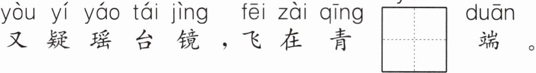 \begin{array} { c } { yòu yí yáo tái jìng fēi zài qīng } \\ { 又疑瑶台镜,飞在青 } \end{array} \begin{array} { c } { yún } \\ { \begin{array} { | c | c | } \hline { } & { } \\ \hline { } & { } \\ \hline \end{array}\hline { } & { } \\ \hline { } & { } \\ \hline } \end{array}\hline { } & { } \\ \hline { } & { } \\ \hline } duān端。$
