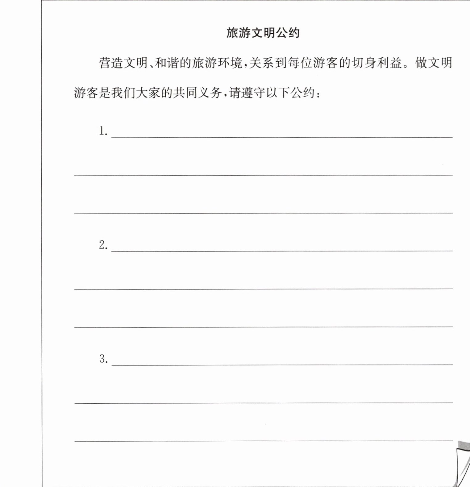 为了更好地用自己的行动爱护自然,爱护文化遗产,爱护祖国的一草一木,请你设计一份《旅游文明公约》。
