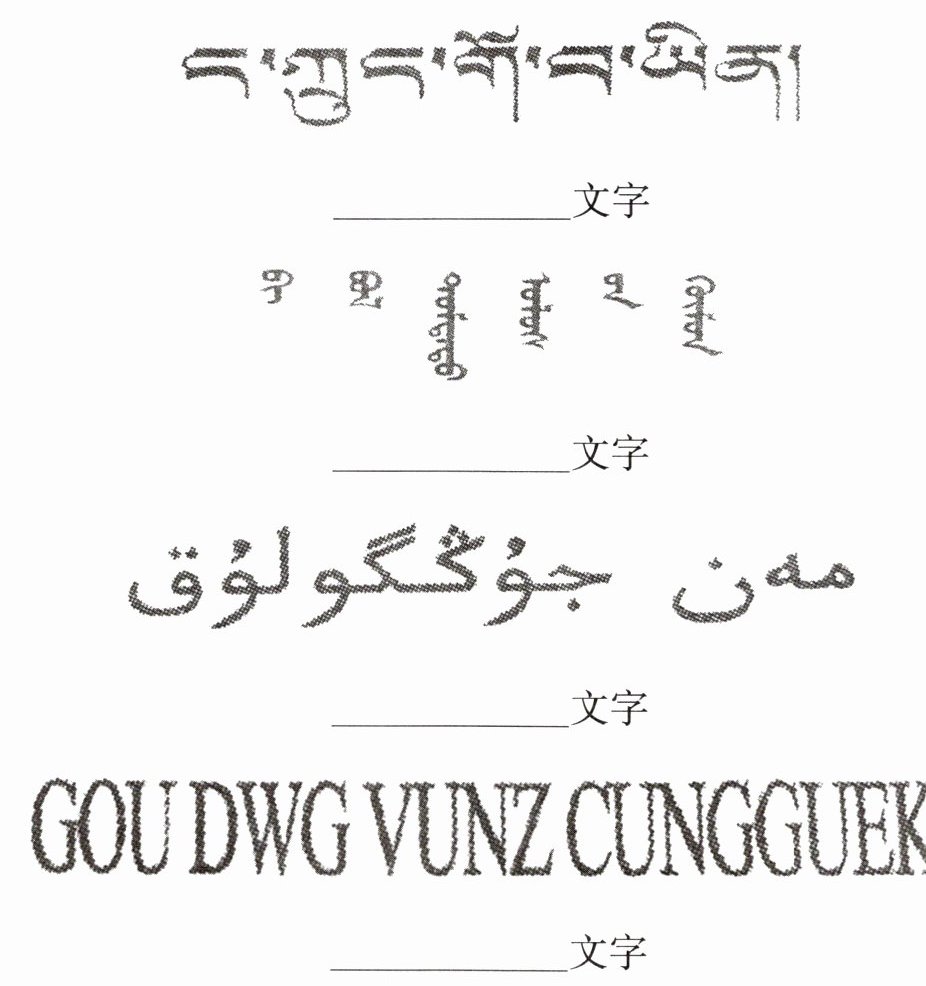 1. 你有没有仔细观察过一张人民币有多少种少数民族文字?下面的几幅图是汉字“我是中国人”对应的少数民族文字,你能猜出它们分别是哪个民族的文字吗?