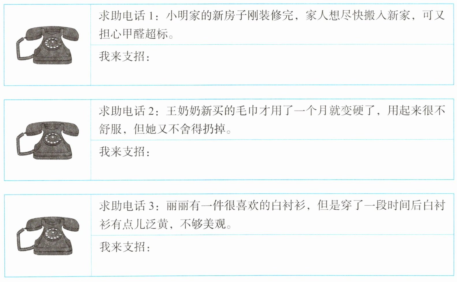 2. 请你化身“科学妙招小专家”,为下面三位打来求助电话的市民解决生活中遇到的困惑。