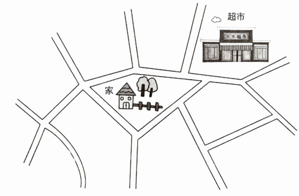 在图中家附近的公共场所可以填写或画出“超市”(图中已标出)以及其他如“公园”“学校”“图书馆”等(可根据实际情况添加)。