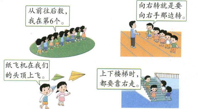 3. 左、右:走路时,一般靠右行走;体育课上,向右转或向左转进行队列变换。
