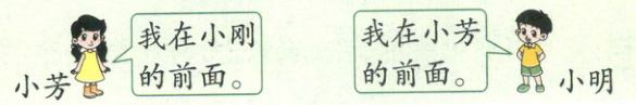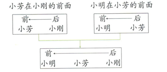 例1 小芳、小刚、小明三人排队。谁在最前面,谁在最后面?
