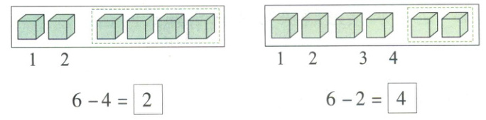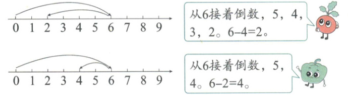 思路点拨:要求休息的有几人,就是从总人数6人中去掉正在滑的4人,列式为6 - 4。要求正在滑的有几人,就是从总人数6人中去掉休息的2人,列式为6 - 2。计算6 - 4和6 - 2时,有以下几种方法: