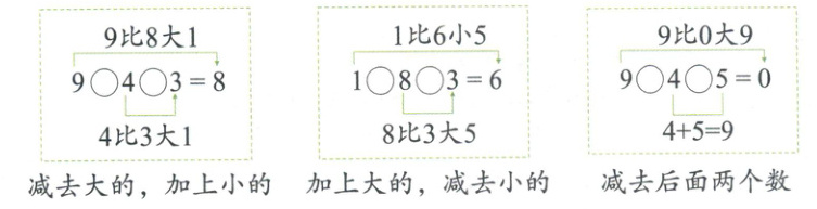 也可以这样想,对于 $ 9 ◯ 4 ◯ 3 = 8 $ 和 $ 9 ◯ 4 ◯ 5 = 0 $ 来说,第一个运算符号都只能是“-”,则有 $ 9 - 4 + 3 = 8 $,$ 9 - 4 - 5 = 0 $;对于 $ 1 ◯ 8 ◯ 3 = 6 $ 来说,$ 1 < 8 $,所以第一个运算符号只能是“+”,则有 $ 1 + 8 - 3 = 6 $。