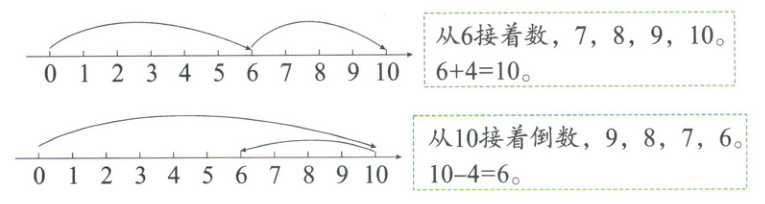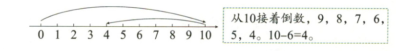 计算6 + 4时,可以用接着数的方法;计算10 - 4和10 - 6时,可以用倒着数的方法。