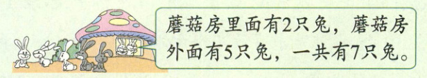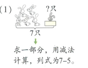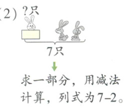 思路点拨:根据题意可知,一共有 7 只兔,其中有 5 只白兔,2 只灰兔。题中分别要求的是灰兔和白兔的只数,且都用减法计算,因此都是已知整体求部分,即从总数里去掉白兔或灰兔的只数,用减法计算。