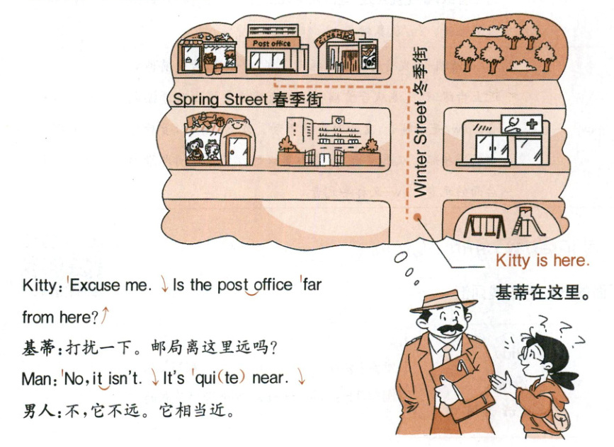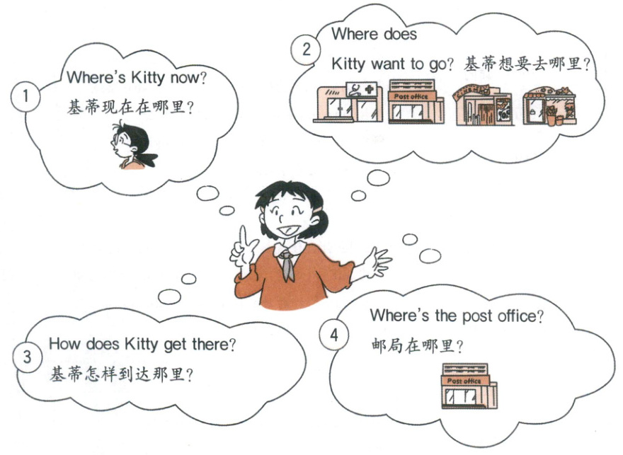 情景描述 Kitty 想去邮局,但是她不知道路。看一下她是如何问路的吧。