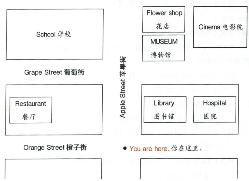参考答案 S1: Excuse me. How do I get to the school? S2: Walk along Apple Street and turn left at Grape Street. You can see the school on your right. S1: Thank you. S1: Excuse me. How do I get to the museum? S2: Walk along Apple Street and turn right at Grape Street. You can see the mu- seum on your left. S1: Thank you. S1: Excuse me. How do I get to the flower shop? S2: Walk along Apple Street. You can see the flower shop on your right. S1: Thank you. S1: Excuse me. How do I get to the restaurant? S2: Turn left here. Walk along Orange Street. You can see the restaurant on your right. S1: Thank you. S1: Excuse me. How do I get to the hospital? S2: Turn right here. Walk along Orange Street. You can see the hospital on your left. It's next to the library. S1: Thank you.