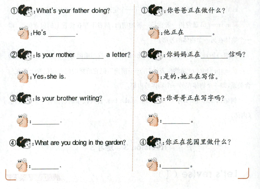 ① cooking ② writing ③ No,he isn't,He is painting a picture ④ I am watering the flowers