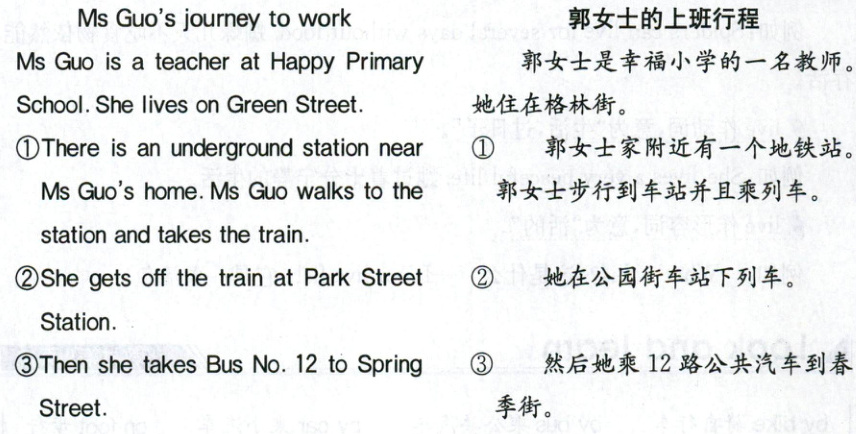 本部分介绍了幸福小学的 Ms Guo 的家庭住址及其上班路线。