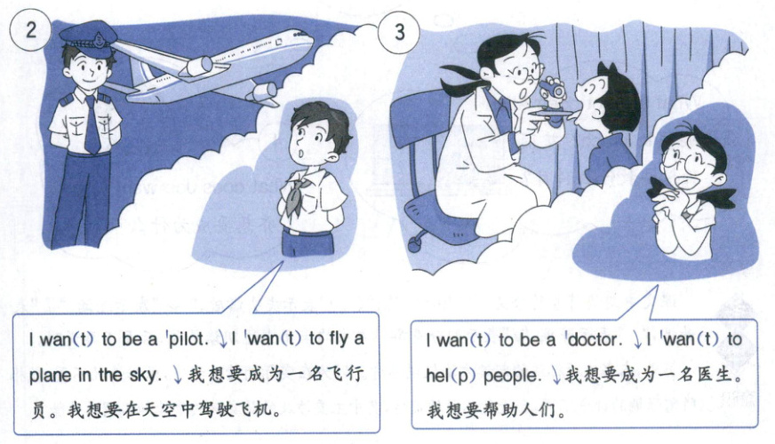 I wan(t) to be a 'pilot. ↓ I 'wan(t) to fly a plane in the sky. ↓ 我想要成为一名飞行员。我想要在天空中驾驶飞机。