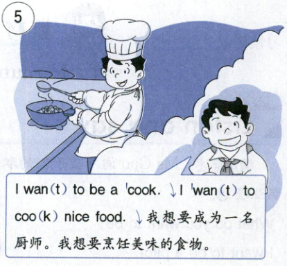 I wan(t) to be a 'teacher. ↓ I 'wan(t) to teach English in a school. ↓ 我想要成为一名教师。我想要在学校里教英语。