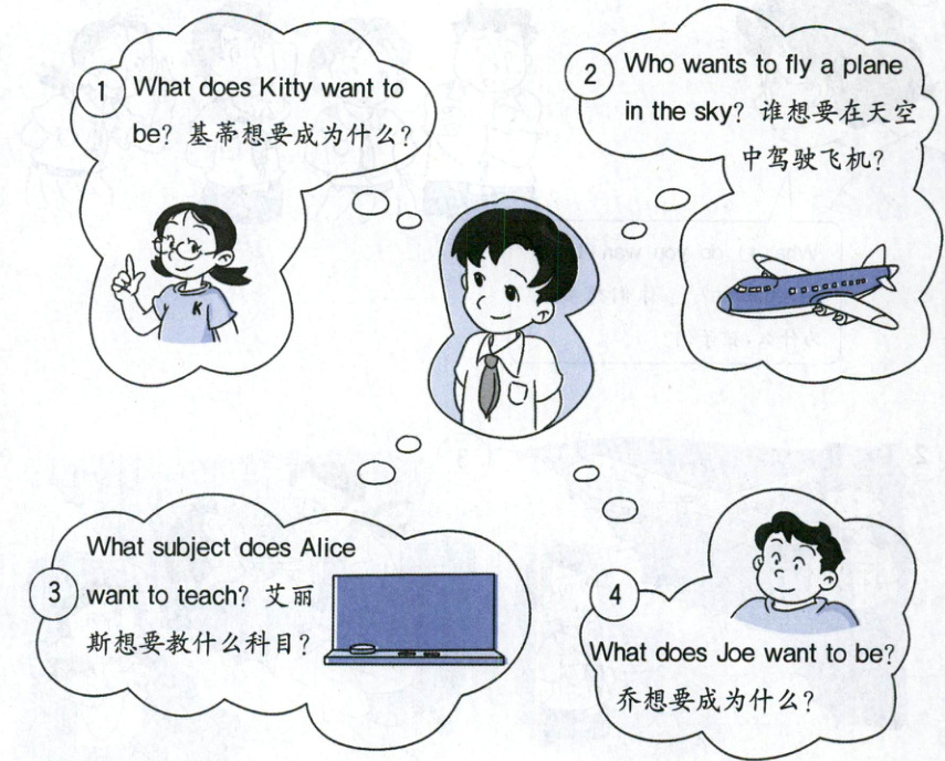 参考答案 ①She wants to be a doctor. ②Peter. ③She wants to teach English. ④He wants to be a cook.