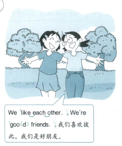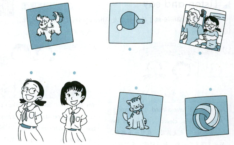 We 'both li(ke) sport. ↓ I 'li(ke) playing table tennis / and Alice 'likes playing volley - ball. ↓ We 'both love animals. ↓ I 'have a cat / and Alice 'has a dog. ↓