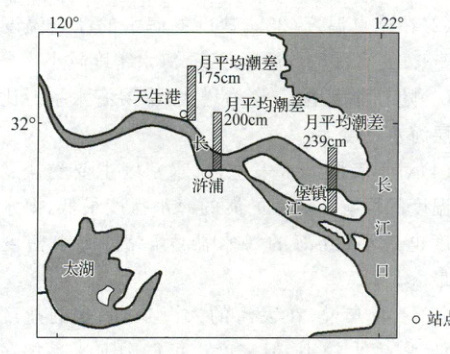 (2024·安徽选择考)潮差是指潮水的一次涨落过程中最高水位与最低水位之差。如图为2024年4月上海堡镇、苏州浒浦、南通天生港三地的月平均潮差。据此完成(1)(2)题。