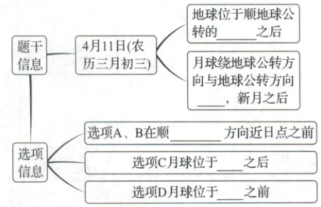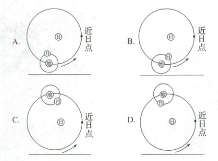 (2)天生港4月11日(农历三月初三)潮差为该月最大。该日的日、地、月三者相对位置关系可示意为(