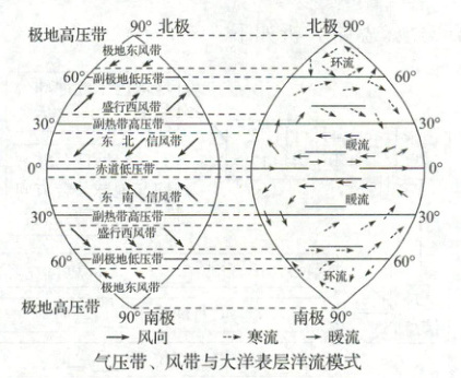2. 洋流与气压带、风带的关系:
