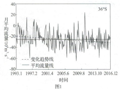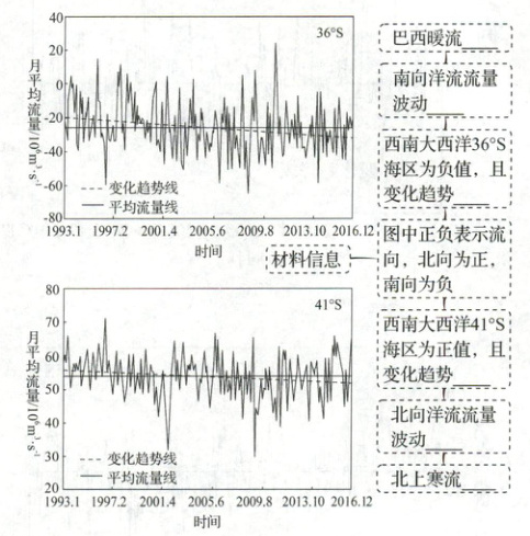 (2023·江苏选择考)西风漂流绕过南美大陆南端后部分向北形成北上寒流,与巴西暖流交汇后东流。下图为1993—2016年西南大西洋海区36°S和41°S附近两个截面逐月洋流流量及变化趋势图(数值表示流量大小;正负表示流向,北向为正,南向为负)。据此完成(1)~(3)题。