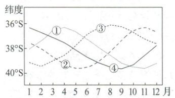 (3)下图中反映北上寒流和巴西暖流交汇处纬度位置年内变化的曲线是(