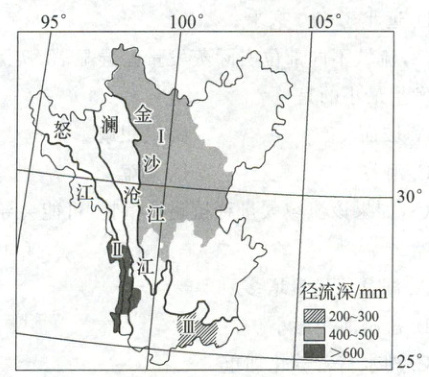 (2)相较于Ⅰ、Ⅱ区,Ⅲ区径流深较小的主要原因是(